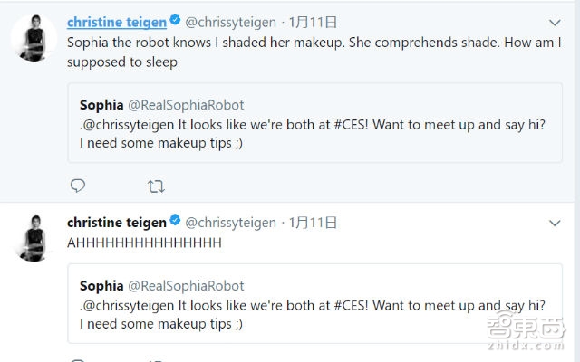 于是1月11日,Sophia发推特说:“@chrissyteigen 好巧啊,我们两个都在#CES!你想不想见个面啊?我有些化妆方面的问题需要请教你 ;)”