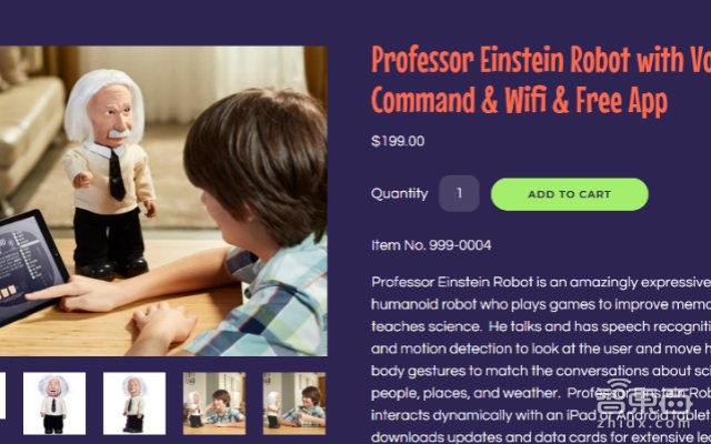 这个爱因斯坦机器人售价199美元,15英寸高,具有语音识别和运动检测的功能,可以给孩子讲科学方面的知识。