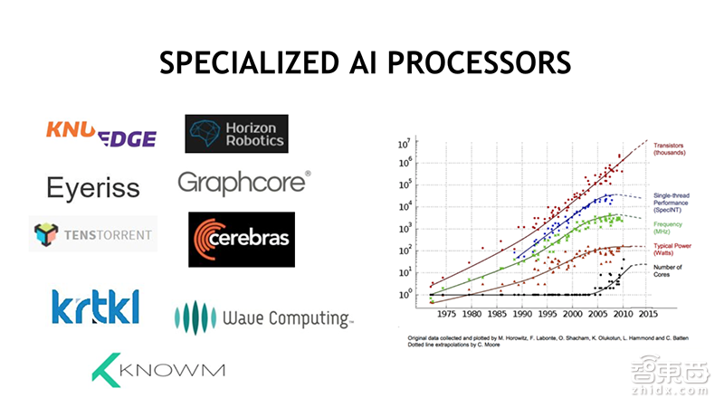 由于AI的广泛铺开,也催生了目前市场上一大批新兴AI芯片创业公司的出现。PPT里的大多是国外代表公司,中国也差不多有几十家公司在研发新型AI芯片。