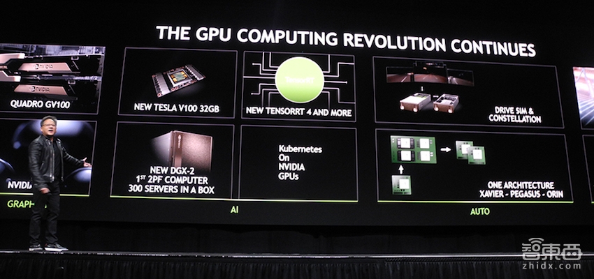 在现场,老黄还展示了英伟达DRIVE的研发路径,它们都基于同一框架、满足ADSL-D的安全标准、并且性能/功耗比非常高:从DRIVE PX Parker、到DRIVE PX 2、再到DRIVE Xavier、再到DRIVE Pegasus……