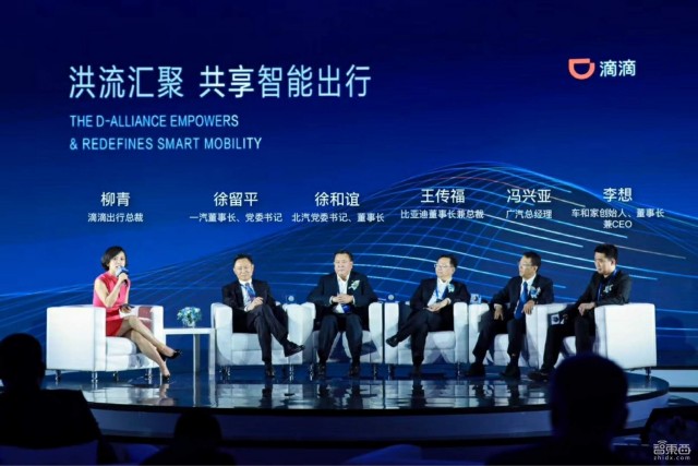 当一汽董事长徐留平、北汽董事长徐和谊、比亚迪董事长王传福、广汽总经理冯兴亚、车和家董事长李想在滴滴总裁柳青身旁一字排开时,现场的闪光灯开始疯狂亮起——你很难看到一家企业的活动同时凑齐了中国汽车圈各成焦点却难得同台亮相的几个人。
