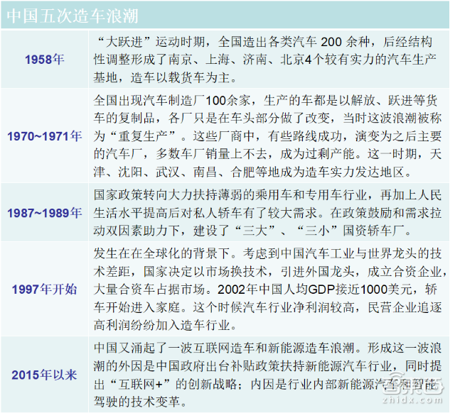 新中国成立之后的四次造车浪潮,两次是改革开放前(形成了天津、沈阳、武汉、南昌、合肥等造车实力发达地区),两次是改革开放后(形成现在中国汽车行业基本格局)。纵观全史,造车浪潮的形成有政策推动、需求拉动和技术变革三大因素。