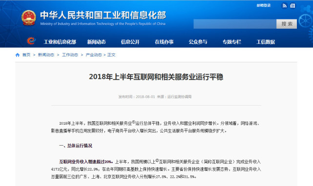 2018年上半年,我国互联网和相关服务业运行总体平稳,业务收入和营业利润同步增长。分领域看,网络游戏、影音直播等手机应用发展较好,电子商务平台收入增长突出,公共生活服务平台服务规模稳步扩大。