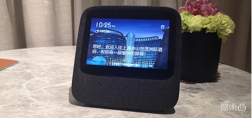 走进客房,你会在床一侧的床头柜上发现这款百度专门为酒店场景定制的小度在家智能视频音箱,屏幕背景是“深坑酒店”的外观图,下面是入住的欢迎语。