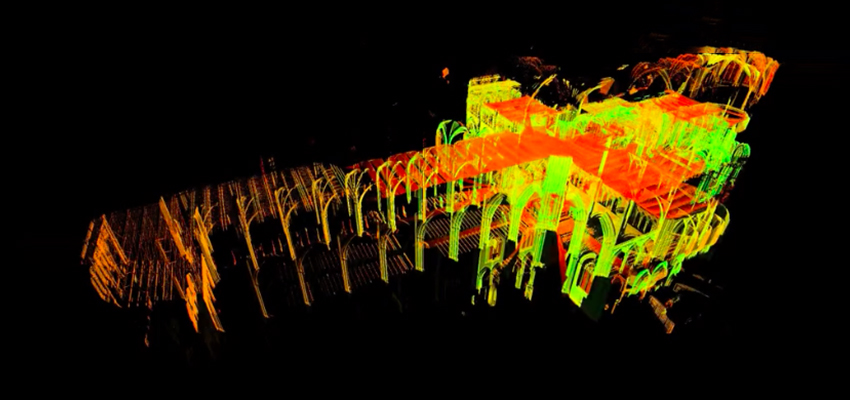 激光扫描仪不断扫描大教堂内部的每个表面和结构特征,测量扫描仪本身与激光撞击点之间的距离。