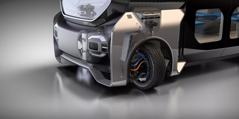 电机在每个单独的车轮中增加转向动能,由于车轮与车身间连接点较小,所以可以实现360°灵活转向,特别之处在于,空气悬挂系统也内置于该模块中,因此同时可以实现车辆高度的调节。