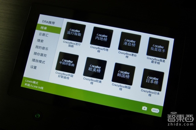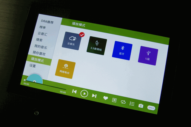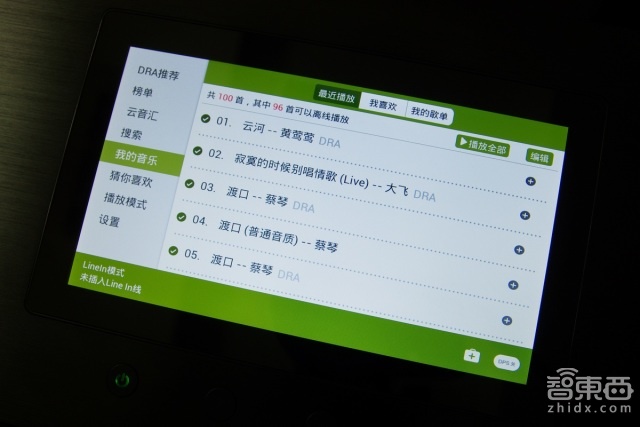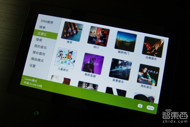 与听音乐有关的菜单集中在屏幕左侧上方,“DRA推荐”、“榜单”、“云音汇”、“搜索”、“我的音乐”、“猜你喜欢”,这些功能从字面上很容易理解。我个人比较喜欢的是“云音汇”的内容,里面将不同音乐类型进行了梳理与细分,很容易找到自己喜欢的音乐类型。经过一段时间的使用,云端也会根据使用者的喜好,将适合使用者的音乐推荐到“猜你喜欢”栏目中。系统也会将最近聆听的100首音乐进行缓冲,减少了网络资源的占用。