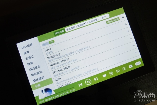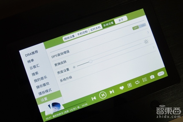 对着电蟒2Pro硕大的液晶屏操作时的感觉,让我想起了几年前使用MP4的经历,功能分布比较清晰操作逻辑简单直观,但缺少了一些时尚感。开机之后首先要进行的是WIFI的连接,在屏幕左侧找到“设置”菜单下的“网络设置”,选择家中的WIFI网络通过验证后,即可连接到云端聆听高品质的云音乐了。在“设置”菜单还可以对屏幕的亮度进行调整,对系统皮肤的颜色进行更改,以及对定时关机进行设置。