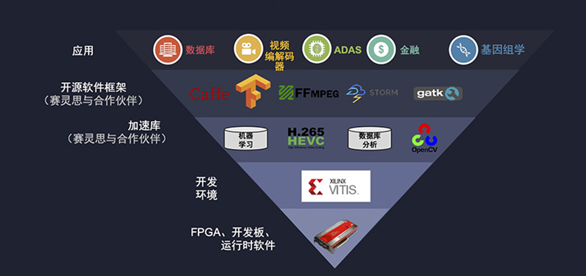 最下方的基石是芯片和板卡,再往上是开发环境、加速库,更进一步是开源软件框架。很多用户不习惯做FPGA开发,想在软件框架中做这些事情,对此赛灵思提供了很多基于框架的软件方案,还提供了面向ADAS、金融、基因组学、视频编解码器、数据库等很多应用。