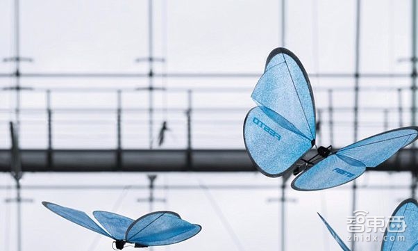 蝴蝶机器人eMotionButterflies——“蓝色飞舞”重32克,翼展长度是0.5米,每秒拍打1-2次翅膀,飞行速度达2.5m/s。每一只蝴蝶机器人都可以被单独操控,蝴蝶机器人可通过翅膀调整自己,按照预编程的路线飞行。不过,缺点是飞行3~4分钟就得充15分钟的电。