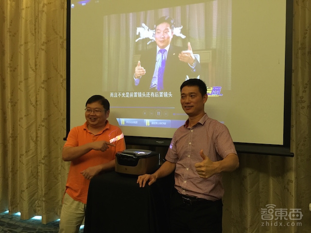 左为安华光电总经理王凡,右为水晶光电副总经理周建军;中间即E100投影样机