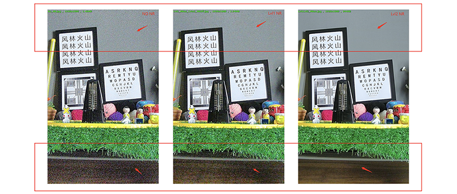 上图左侧是普通图像传感器直出效果,中间是“玲珑”ISP一级降噪效果,右侧是“玲珑”ISP二级降噪效果,可以看到右侧图像中背景和木纹纹理的噪声基本已经消除。