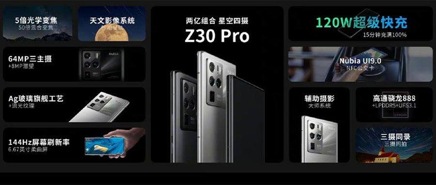 智东西5月20日消息,今天努比亚发布了旗舰智能手机Z30 Pro,搭载了三枚6400万像素镜头,支持手持星轨拍摄。