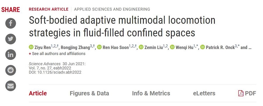 这项研究发表在科学期刊《Science Advances》上,论文标题为《充满流体的密闭空间中的软体自适应多模态运动策略(Soft-bodied adaptive multimodal locomotion strategies in fluid-filled confined spaces)》。