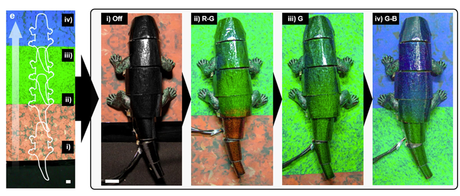 而这次,韩国首尔国立大学的研究人员成功地找到了实现这一目标的方法,制造出来了一只人造软体机器人变色龙,身体颜色可以跟随环境颜色变化产生相应的变化。