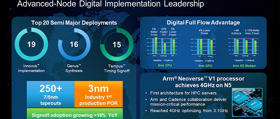 Anirudh Devgan称,在数字设计领域,Cadence的各类产品都取得了很好的成绩。比如Innovus Implementation被前20大半导体公司中的19家使用,Genus Synthesis被前20大半导体公司中的16家使用,Tenpus Timing Signoff则被前20大半导体公司中的15家采用。Cadence也和Arm一起,在台积电N5工艺节点上实现了4GHz成果。