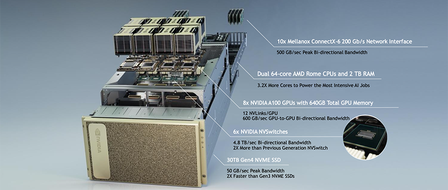 DGX SuperPOD 采用模块化的设计,支持不同规模大小的设计。一个标准的 SuperPOD 由 140 台 DGX A100 GPU 服务器、HDR InfiniBand 200G 网卡和 NVIDIA Quantum QM8790 交换机构建而成,针对超大语言模型预训练这一复杂场景,帮助 AI 研究人员快速搭建一套强大、灵活、高效的系统。