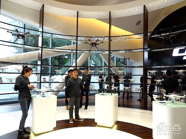 位于深圳欢乐海岸的首家直营旗舰店面积大约为800平方米,展示了除MG-1农业植保机外的所有大疆产品,涵盖Phantom 3系列、Inspire系列等热门消费级无人机,Osmo手持云台、禅思X5航拍相机等周边产品,以及Ronin-M、S900等专业级无人机。同时,以上产品均可在店内直接购买。