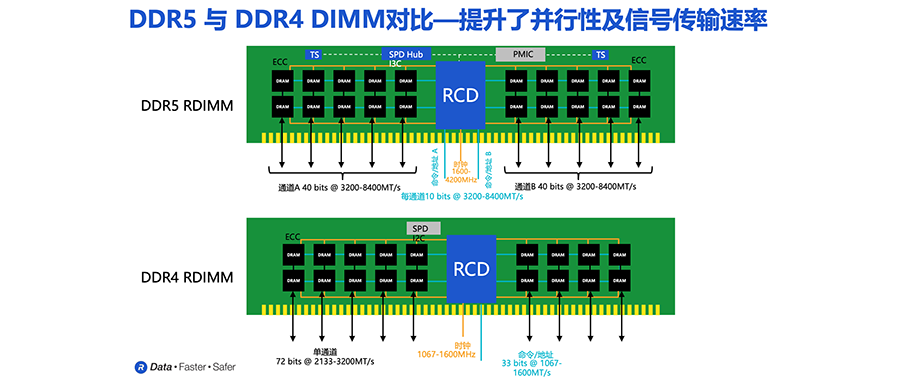 Rambus内存互连芯片业务部门产品营销副总裁John Eble谈道,不断发展的服务器市场对DDR5内存标准提出更高要求,必须要保证在64字节高速缓存行中相同的内存读取粒度,优化性能、可靠性、可用性和可维护性,同时在性能保持不变的情况下将产品运行维持在正确的冷却功率范围之内,并进一步缩短启动时间。