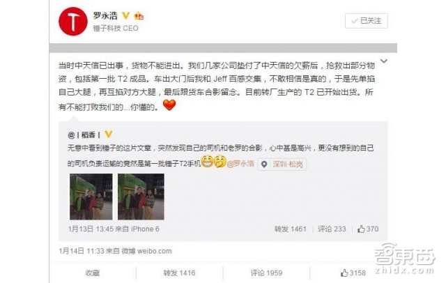 去年12月底、锤子T2发布前几天,网上流传出锤子T2代工厂“无力运营、通知解除劳动的通知”截图,锤子官方后来证实锤子T2被迫停产,但同时表示中天信代工的T2已出厂。