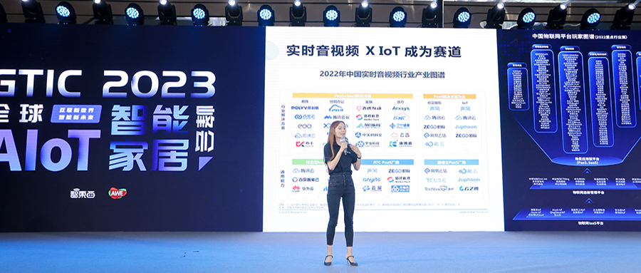 作为全球实时互动API平台开创者和引领者的声网,同样看到了这一趋势。在AWE同期的GTIC 2023全球AIoT智能家居峰会上,声网IoT负责人侯云忆以《声网实时互动:开启智能家居「真互动」时代》为主题进行了演讲。
