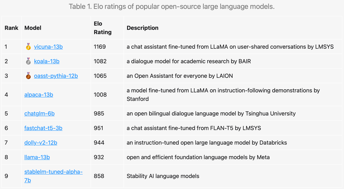 在现有排行榜中,排名前五的分别是130亿参数的UC伯克利Vicuna模型、130亿参数的UC伯克利Koala模型、120亿参数的LAION Open Assistant模型、130亿参数的斯坦福大学Alpaca模型、60亿参数的清华大学ChatGLM模型。