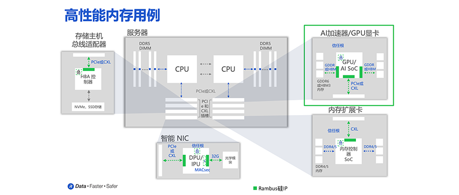 总体来说,Rambus通过领先的高性能内存和互联解决方案以及硬件级安全,支持下一代数据中心的发展。其产品应用领域聚焦于服务器主内存、人工智能和网络加速器、智能网卡、网络存储、网络交换机以及内存扩展和池化等。
