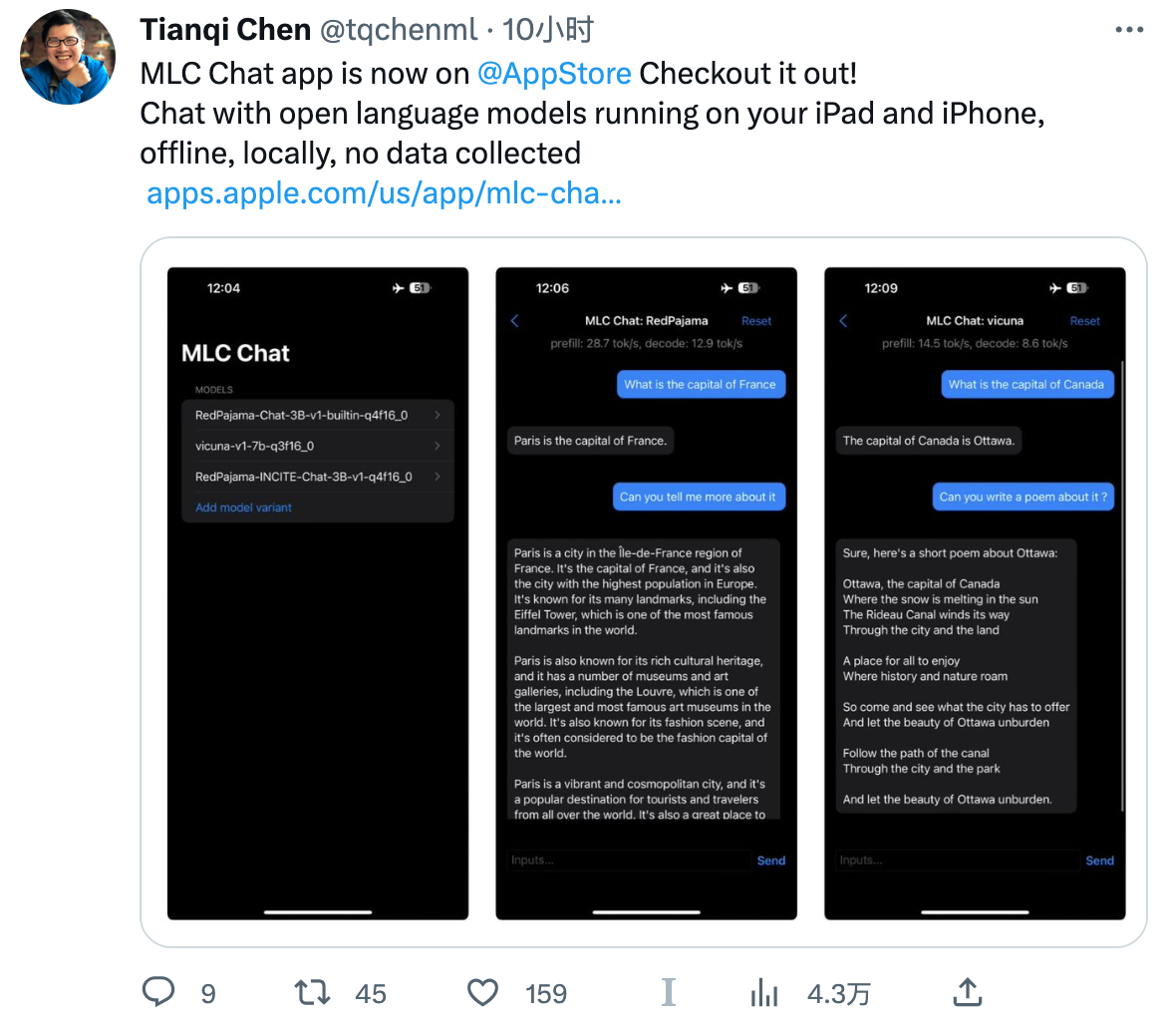 今日,CMU助理教授、OctoML CTO陈天奇发推文宣布MLC Chat app已在苹果App Store上线。这款应用程序支持用户与iPad和iPhone上运行的开源语言模型聊天,离线、本地运行,不收集数据。