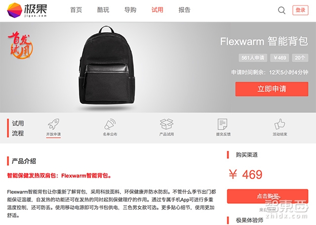 其最新产品Flexwarm发热背包已经在极果网免费试用招募中[点击申请]。