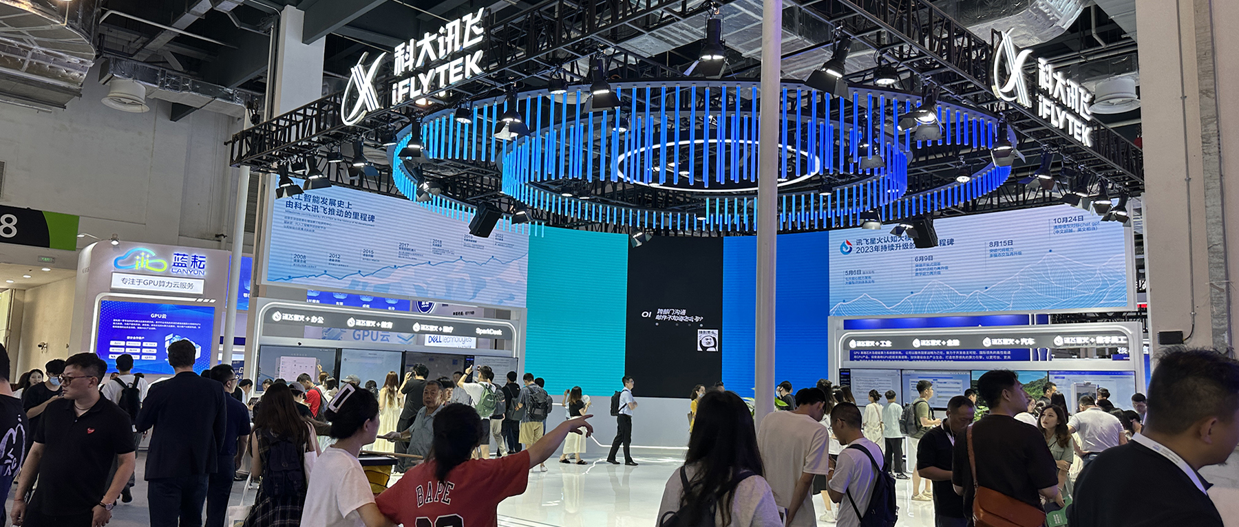 因此,展台上,星火大模型演示屏左右两侧,延伸出大模型+办公、教育、医疗、工业等行业的应用演示,每个展台前都聚焦了大量的观众。
