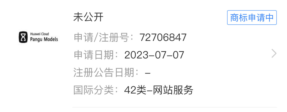 天眼查App显示,华为技术有限公司近日申请注册了“华为云盘古”、“Huawei Cloud Pangu Models”文字及图形商标,国际分类为网站服务、社会服务,当前状态均为申请中。