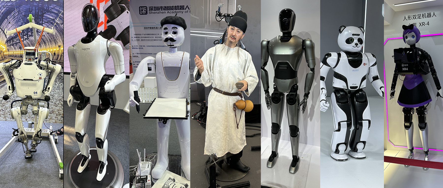 这届世界机器人大会与往届最大的不同是:人形机器人太太太多了!往年只能看到一到两个的人形机器人,今年十多个扎堆出现,既有李白、杜甫等仿生机器人,也有“钢筋铁骨”的小米铁大、优必选Walker X,还有大秀唱跳才能、咖啡拉花、给人画像的各式人形机器人。