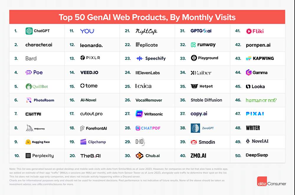 15、a16z发布全球访问量Top 50 AI产品榜单