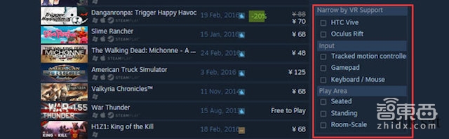 Valve扩展Steam游戏分类,这次加入的类别详细分为三项,第一项是指定的虚拟现实头显,目前仅支持HTC Vive和Oculus Rift;第二项是游戏所支持的输入设备,列表中有键盘,游戏手柄或者运动控制器;第三项是支持的游戏区域,分别有坐着,站着或房间大小的走动模式(room-scale)。用户可在右边选择这些类别从而筛选出适合的虚拟现实游戏。