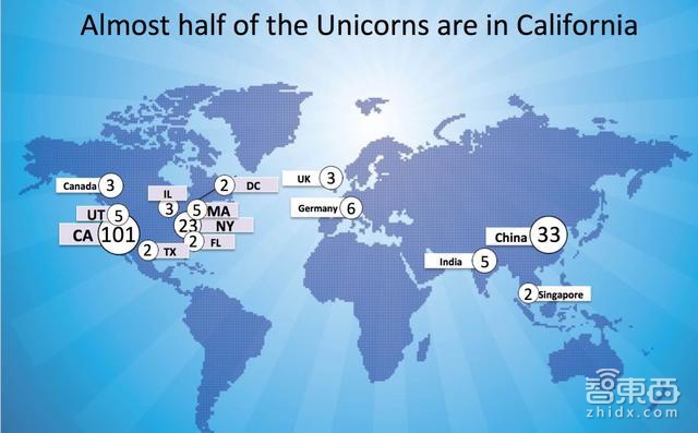 在全球范围内,美国有143家独角兽企业占大半江山,其中加州就有101家企业上榜,纽约有23家企业上榜。除加州和纽约外,没有城市比北京的独角兽更多。33家上榜中国企业分布趋势呈现为北京独角兽腾讯系居多、上海三家金融独角兽、杭州城建在阿里身上。