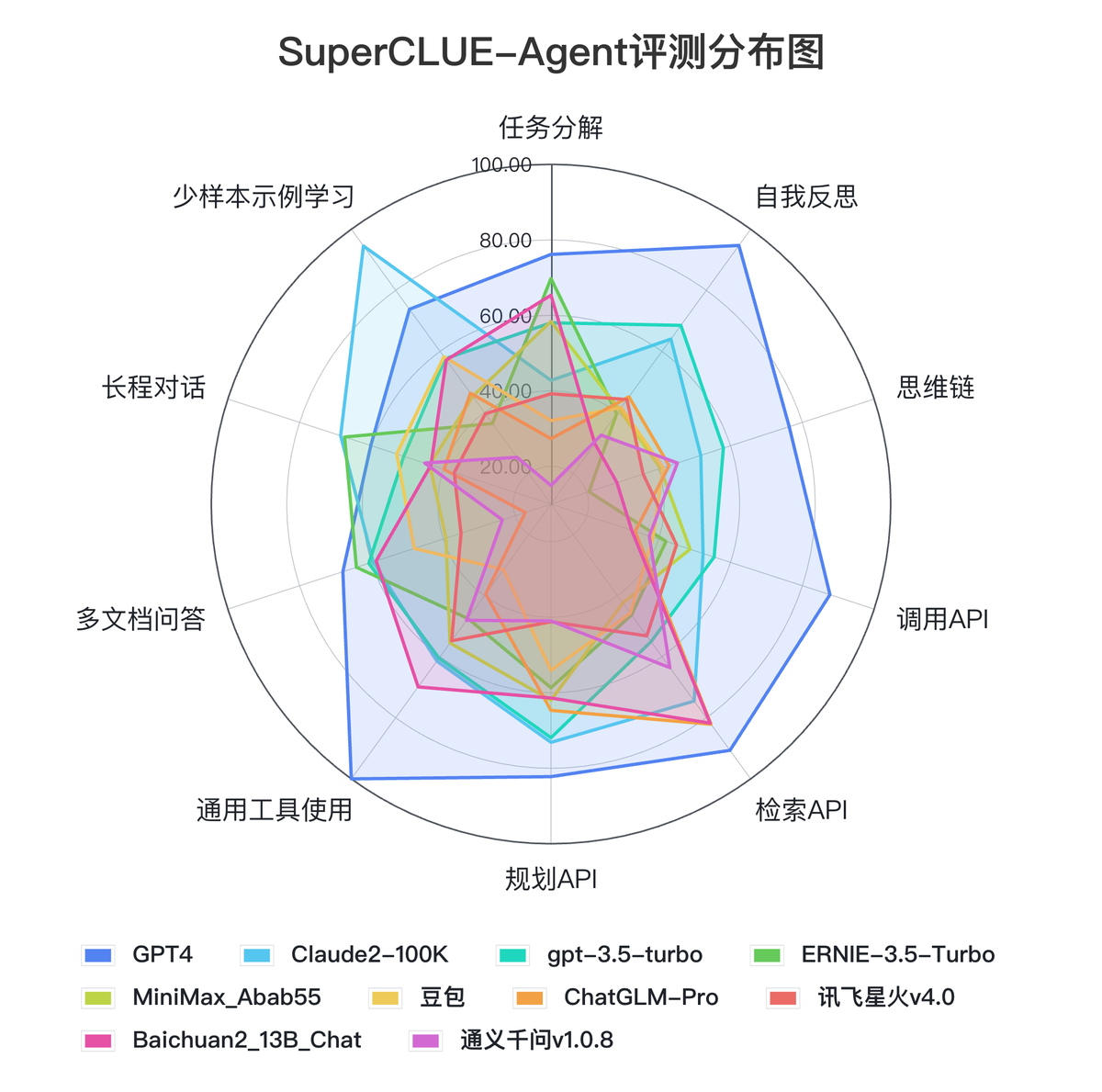 据CLUE中文语言理解测评基准微信公众号发文,今天,SuperCLUE宣布推出面向AI智能体的测评基准SuperCLUE-Agent。这是一个聚焦于Agent能力的多维度基准测试,包括3大核心能力、10大基础任务,可以用于评估大语言模型在核心Agent能力上的表现,包括工具使用、任务规划和长短期记忆能力。经过对16个支持中文的大语言模型的测评,SuperCLUE发现:在Agent的核心基础能力中文任务上,GPT4模型大幅领先;同时,代表性国内模型,包括开源和闭源模型,已经较为接近GPT3.5水平。