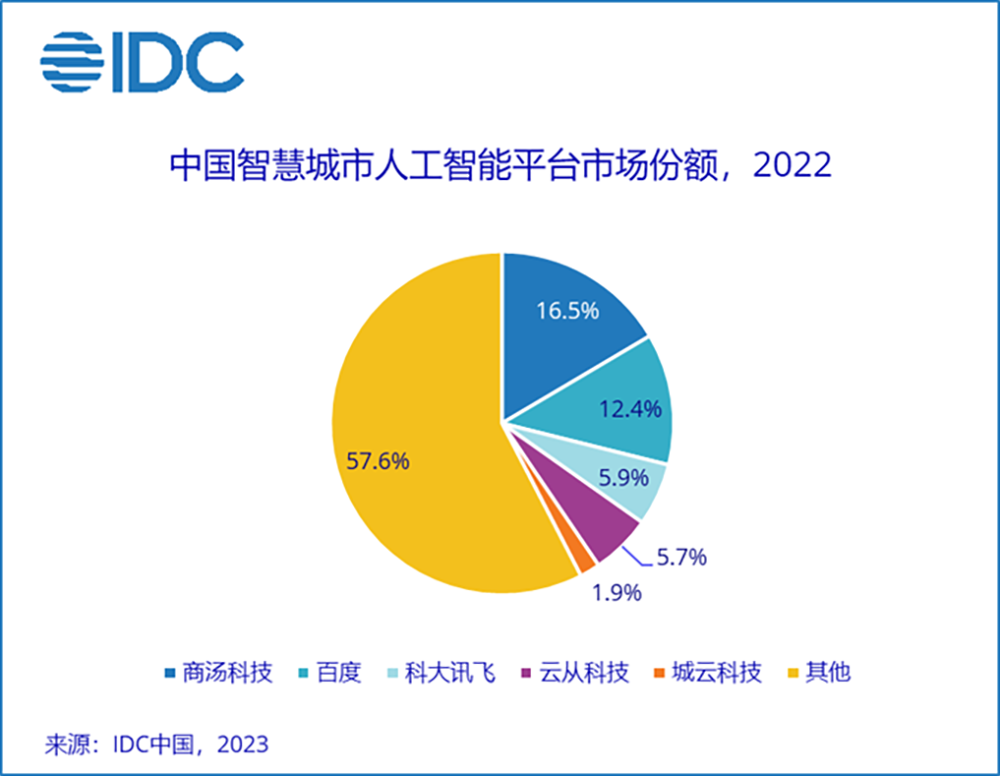 据IDC咨询微信公众号发文,IDC今天发布《中国智慧城市人工智能平台市场份额,2022》报告,预计未来5年,AI将进入大规模落地应用关键期。报告称,2022年,中国智慧城市AI平台市场规模53.2亿元人民币,同比下降4.2%。从整体市场竞争格局来看,商汤科技、百度、科大讯飞在智慧城市AI平台市场排名前三;云从科技、城云科技位列第四、第五。智慧城市AI市场整体呈现出明显的头部厂商规模化效应,前五大厂商共占据42.4%的市场份额。