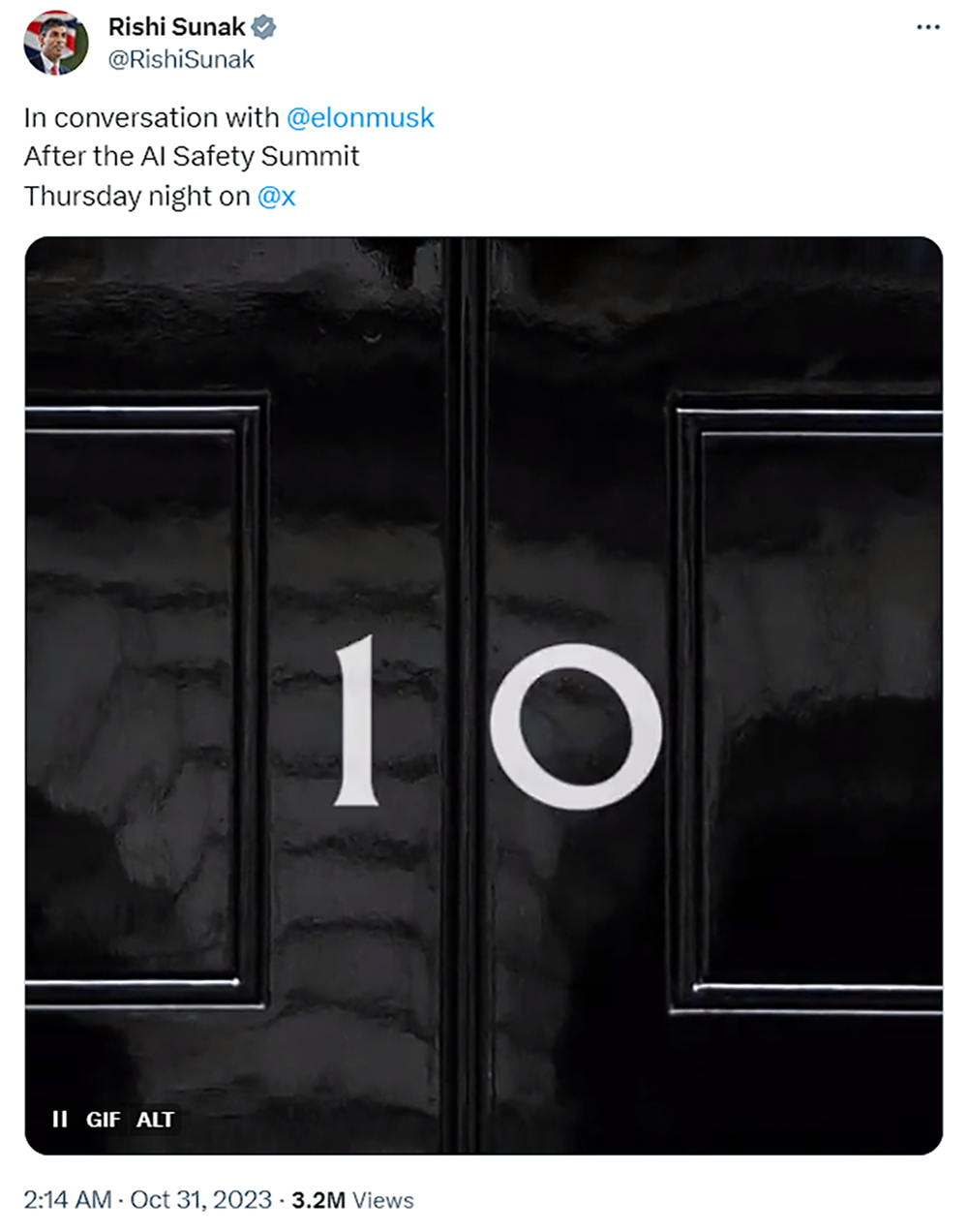 6、苏纳克将于周四AI峰会后与马斯克线上直播对话