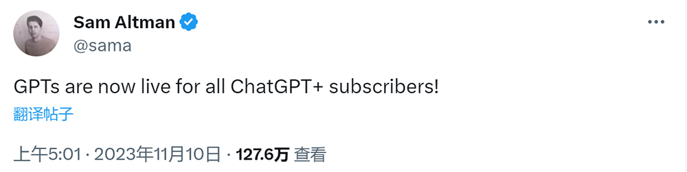 今天凌晨,OpenAI首席执行官Sam Altman在社交平台X上称,GPTs现已对所有ChatGPT+订阅用户开放。