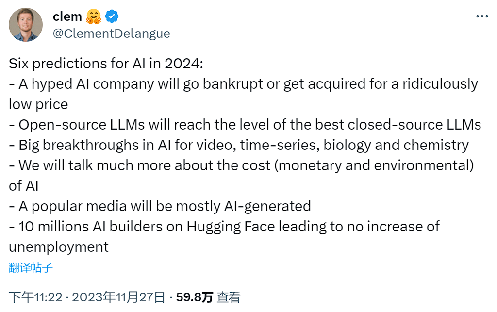 昨日,开源社区Hugging Face CEO克莱门特·德洛夫(Clément Delangue)于社交平台X分享了自己对2024年AI行业的六大预测:一家被大肆宣传的AI公司将破产,或以极低的价格被收购;开源大语言模型(LLM)将达到最好的闭源LLM的水平;AI在视频、时间序列、生物和化学领域取得重大突破;人们将更多地讨论AI的成本,包括经济成本和环境成本;流行媒体将主要由AI生成;千万Hugging Face上的AI工程师将带来新的工作机会,不会增加失业率。