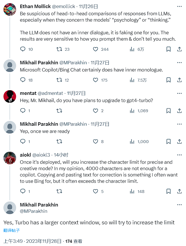 据IT之家报道,微软广告和网络服务负责人Mikhail Parakhin近日在X上称,团队正在积极改善Copilot(Bing Chat),在解决某些问题之后,会升级到OpenAI的GPT-4 Turbo上。Parakhin称,在升级GPT-4 Turbo之后,字符长度会进一步提升,目前最高输入字数为4000字。