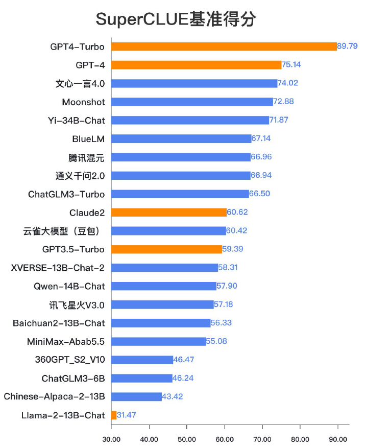 据SuperCLUE微信公众号发文,今日,SuperCLUE发布了《SuperCLUE中文大模型基准测评报告,2023》,基于过去一年对国内外大模型发展趋势和综合效果的实时跟踪,通过多维度综合性测评,对国内外大模型发展现状进行观察与思考。报告显示,目前国内外大模型差距依然明显。GPT-4 Turbo以总分89.79分遥遥领先,高于国内所有大模型及国外代表性大模型。