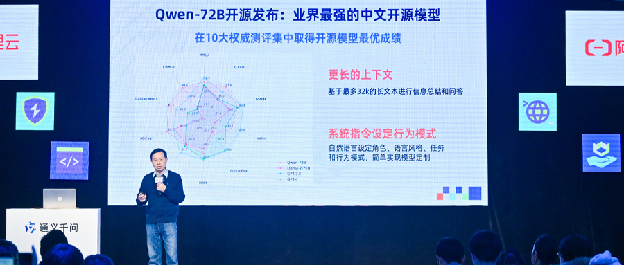 阿里云CTO周靖人称,Qwen-72B在10个权威基准测评中创下开源模型最优成绩,性能超越开源标杆Llama 2-70B和大部分商用闭源模型,为未来企业级、科研级的高性能应用提供了强有力的支持。