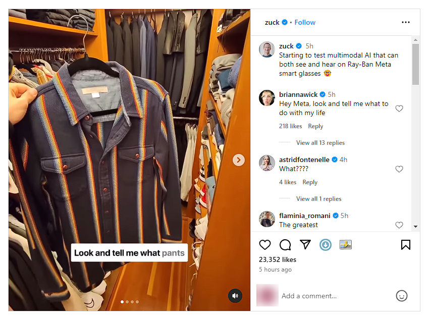 据外媒The Verge报道,Meta今日起在其雷朋智能眼镜中推出多模态AI功能,可以识别物体和翻译语言。用户戴上雷朋智能眼镜,说一声“Hey Meta”,就会召唤出一个虚拟助手,它能看到和听到周围发生的一切。Meta CEO马克·扎克伯格(Mark Zuckerberg)在社交平台Instagram上演示了这一更新,要求眼镜推荐与他手中的衬衫相匹配的裤子。作为回应,虚拟助手描述了这件衬衫,并提供了一些可能与之相配的裤子的建议。他还让眼镜的AI助手翻译文本并展示一些图像说明。该功能目前处于早期测试阶段,在美国小范围测试。