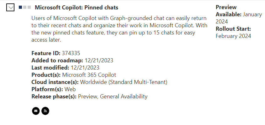 据Microsoft 365路线图今日更新,Copilot将提供新的置顶聊天记录功能,方便之后再次访问,最多可固定15条。该功能将于明年1月开始预览,2月开始正式推出。