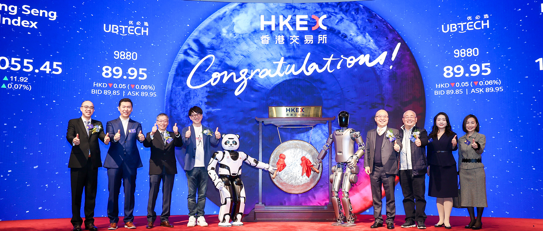 在上市仪式现场,优必选熊猫机器人优悠稳步走上舞台,向优必选科技创始人、CEO周剑递出锣锤,优必选首次亮相的全新一代工业版人形机器人Walker S手持另一个锣锤走向舞台中央,与周剑一起敲响开市锣。