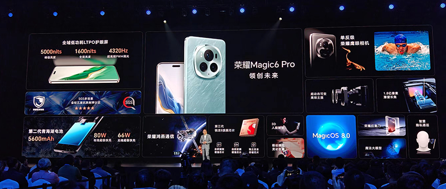 智东西1月11日报道,刚刚,荣耀在深圳召开发布会,推出了Magic6系列旗舰智能手机新品,其首发了荣耀自研的鸿燕卫星通信技术、第二代青海湖电池技术,以及新一代绿洲护眼屏,昨日荣耀刚刚发布的MagicOS 8.0也正式在Magic6系列上落地首发。