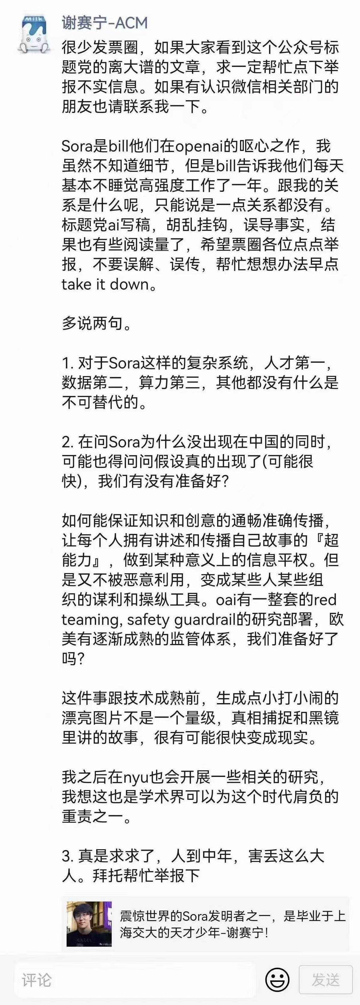 4、谢赛宁否认系Sora发明者