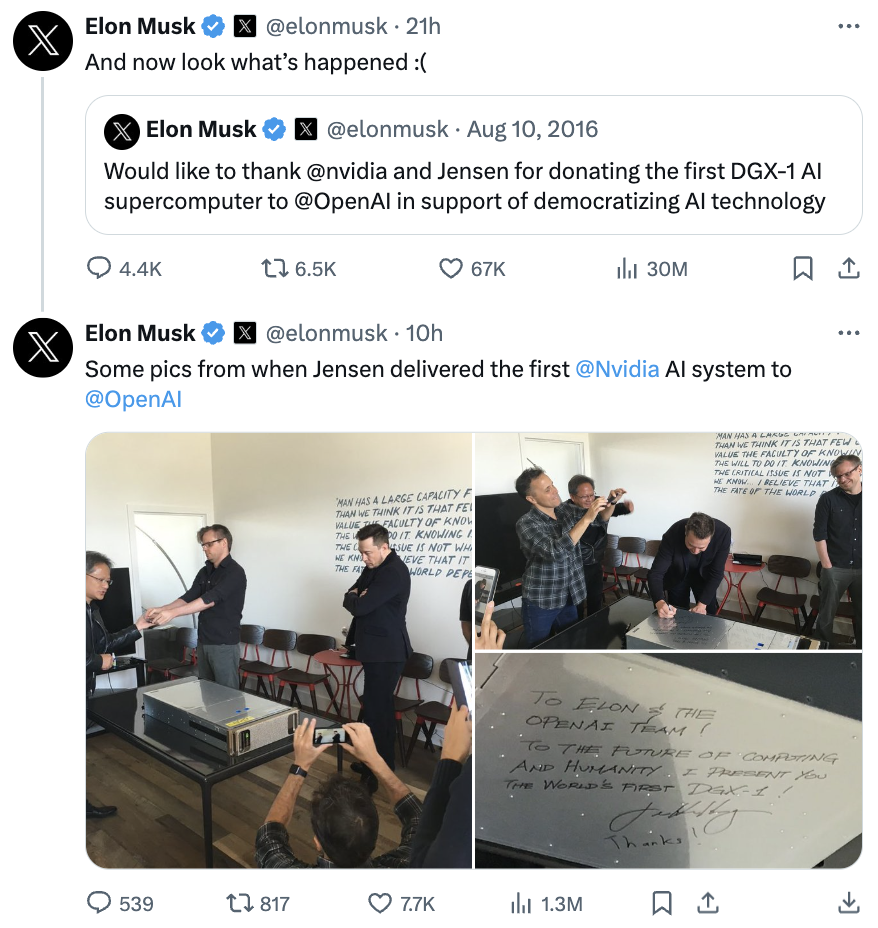 今天,马斯克在社交平台X上连发多条推文施压OpenAI,他转发了2016年8月,OpenAI第一次收到英伟达捐赠DGX-1 AI超级计算机的推文,并说“现在看看发生了什么:(”。同时他还转发了同天发布的OpenAI公司入口处照片,并@OpenAI称,这是OpenAI“最初创建的原因”。马斯克炮轰OpenAI背离初心,言外之意是对AI技术过快的发展表示担忧。