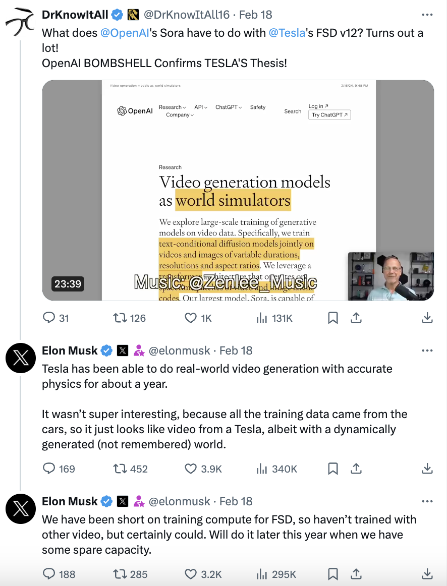 今天,马斯克在社交平台X上回复网友称,一年以前,特斯拉就已经能以精确的物理生成真实世界的视频,但由于训练数据来自汽车,所以生成的视频并不有趣,因此即便具有动态生成的内容也看起来像来自特斯拉的视频。他称特斯拉缺乏FSD的训练算力,因此没有用其他视频进行训练,今年晚些时候,当特斯拉有闲置算力时,他们会进行训练。马斯克转发了2023年特斯拉自动驾驶总监Ashok Elluswamy介绍特斯拉如何用AI模拟真实世界驾驶的相关视频,其中AI生成了7个不同角度视频以实现演示。
